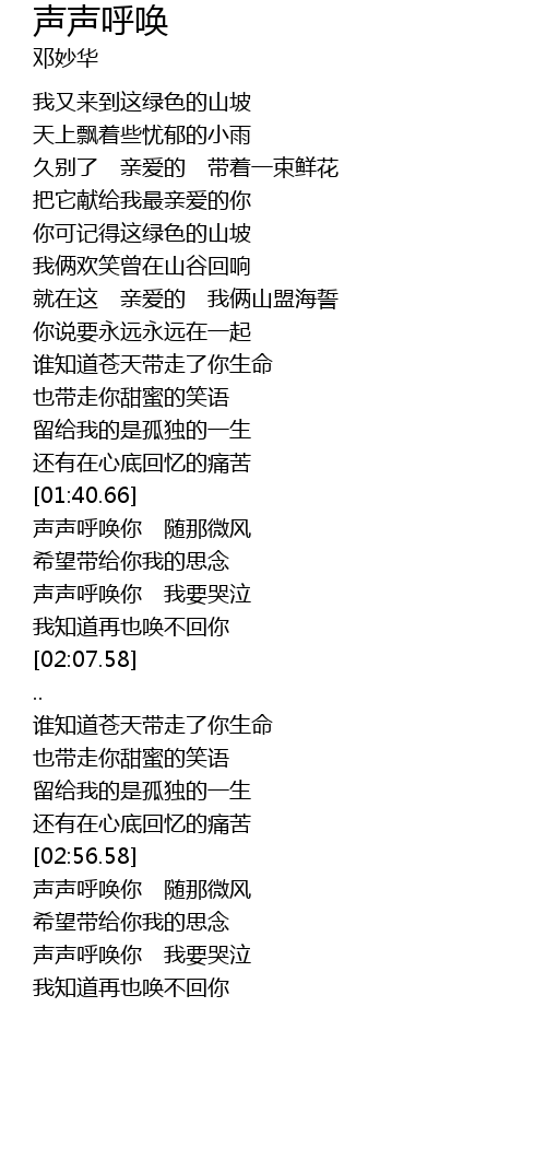 | [01:55.62] | 声声呼唤你 我要哭泣 |