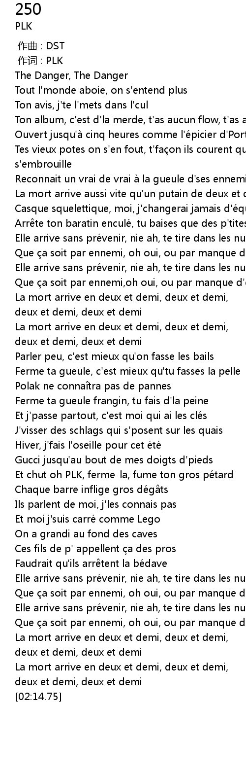 | [01:34.68] | Et chut oh PLK, fermela, fume ton gros pé tard |