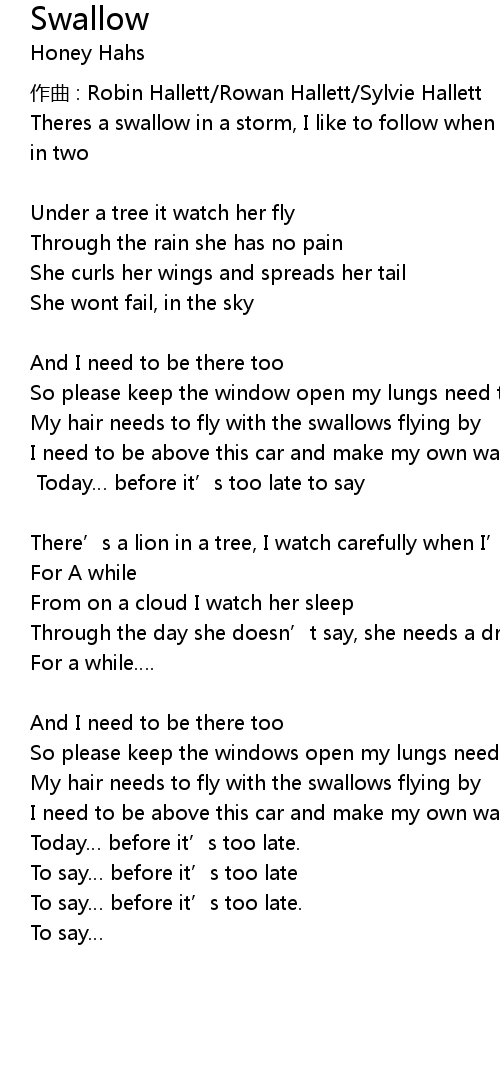 | Theres a swallow in a storm, I like to follow when I’m torn when I’m sawn, in two | |