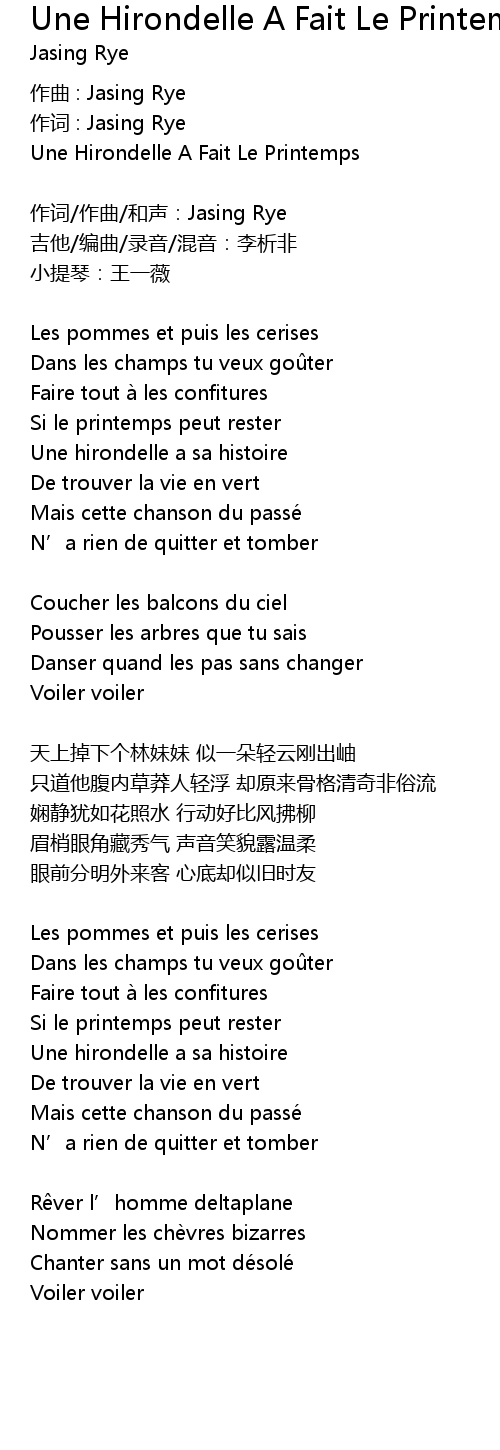 | Song | Une Hirondelle A Fait Le Printemps(独燕成春) |
