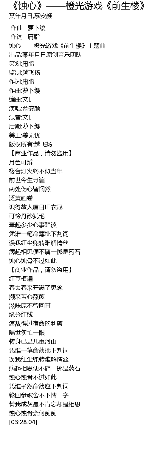 | [00:01.51] | 蚀心——橙光游戏《前生楼》主题曲 |