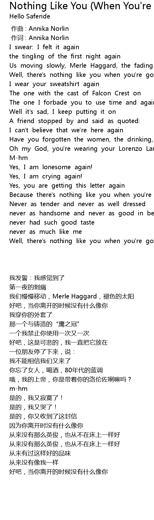 | [00:16.509] | Well, there's nothing like you when you're gone |