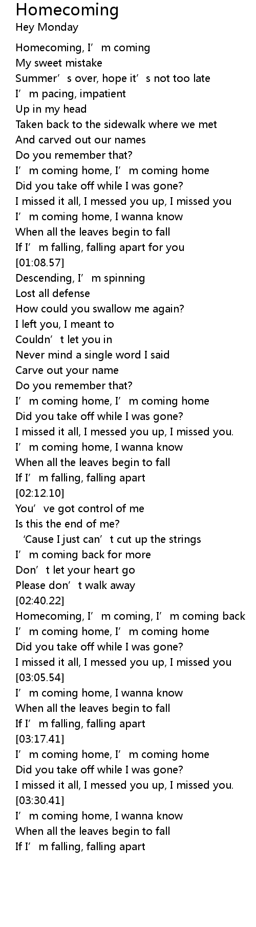 | [00:13.95] | Homecoming, I’m coming |