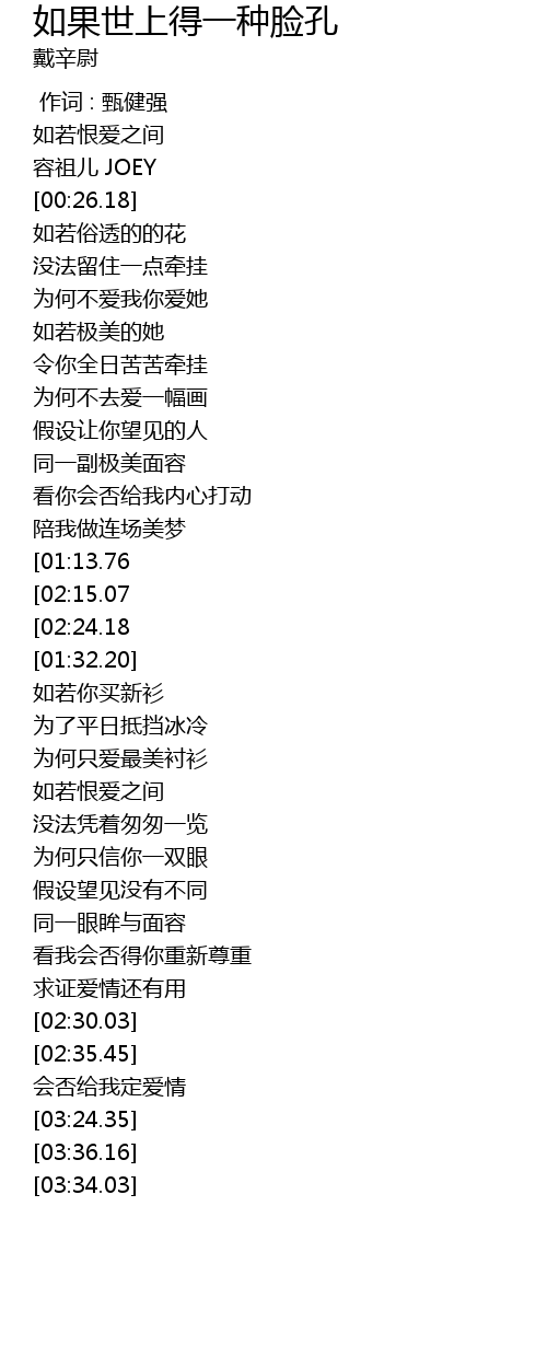 | [01:04.27][01:13.76][02:08.29][02:17.52][02:44.77][02:54.37][03:03.59][03:12.42] | 如果得一种脸孔(脸孔) |