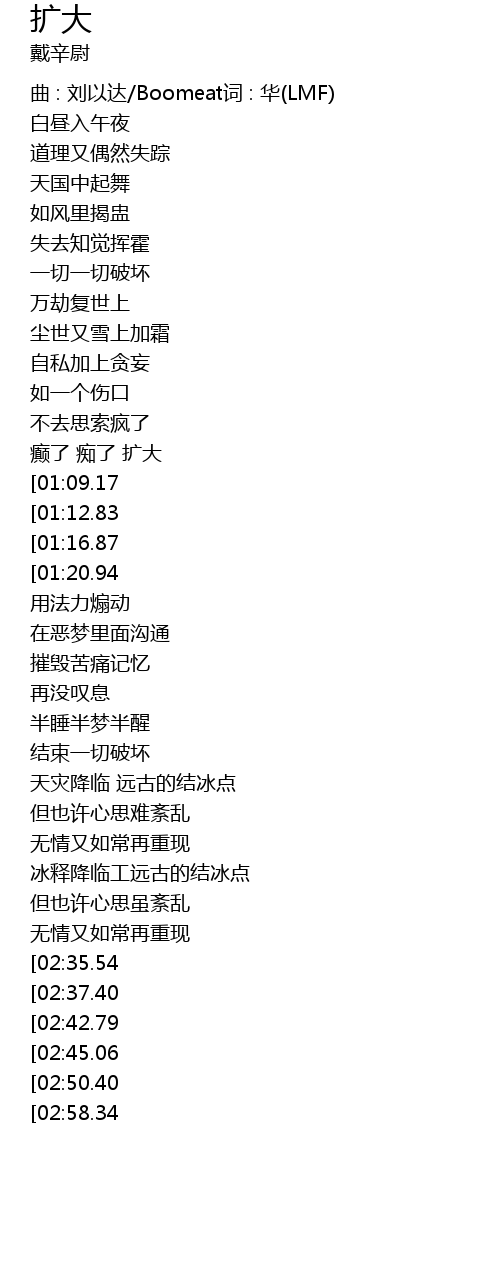 | [00:00.00] | 曲 : 刘以达/Boomeat词 : 华(LMF) |