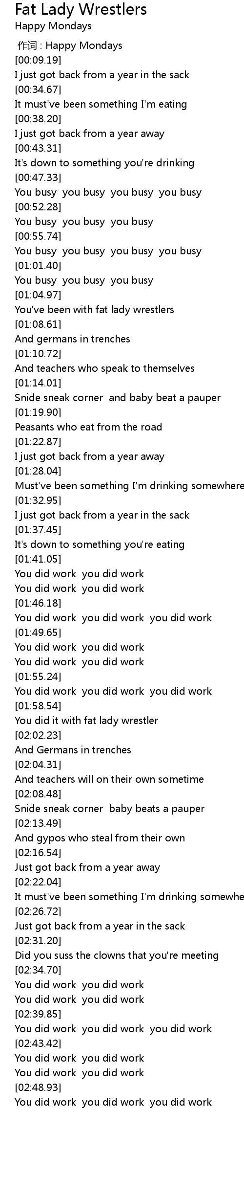 | [02:00.30] | You did it with fat lady wrestler |