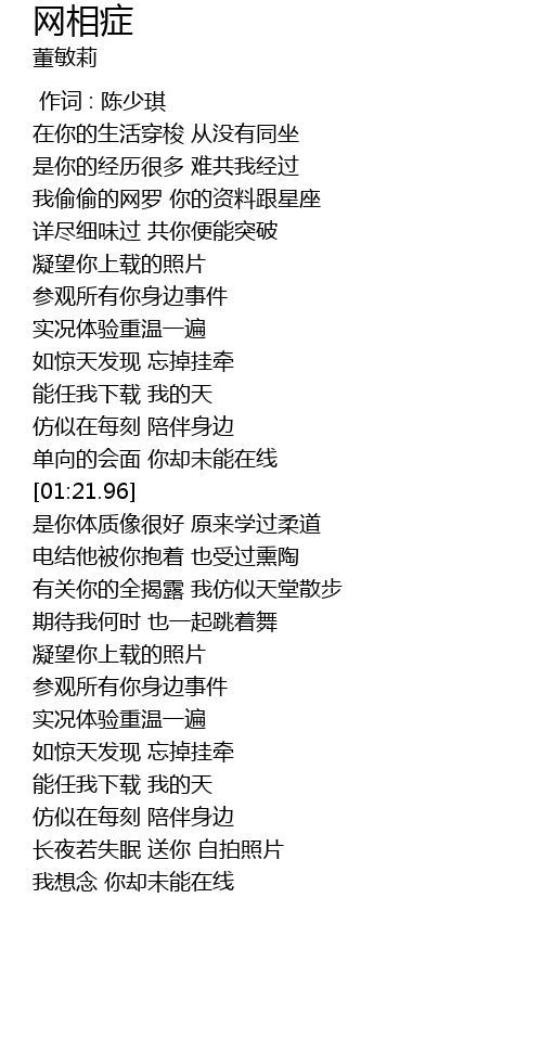 | [01:13.83] | 单向的会面 你却未能在线 |
