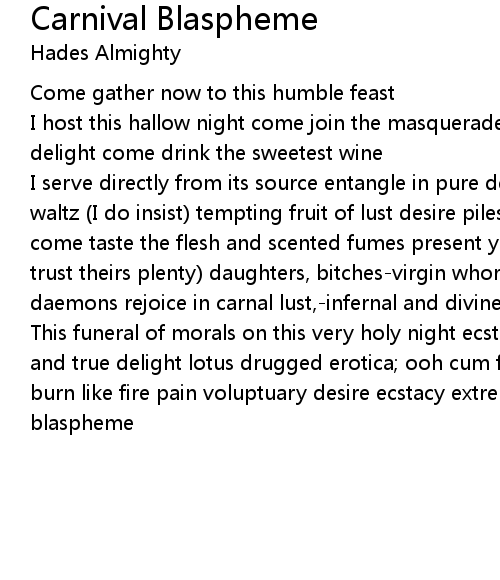 This funeral of morals on this very holy night ecstacy and blasphemy profound and true delight lotus drugged erotica; ooh cum for me my brides take it higher, burn like fire pain voluptuary desire ecstacy extreme attend the orgy carnival blaspheme |