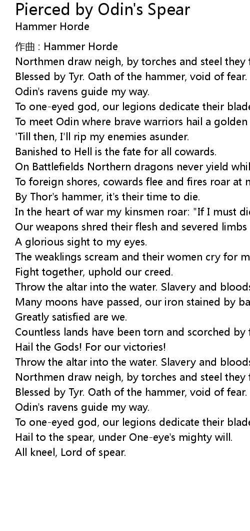 | Hail to the spear, under Oneeye' s mighty will. | |