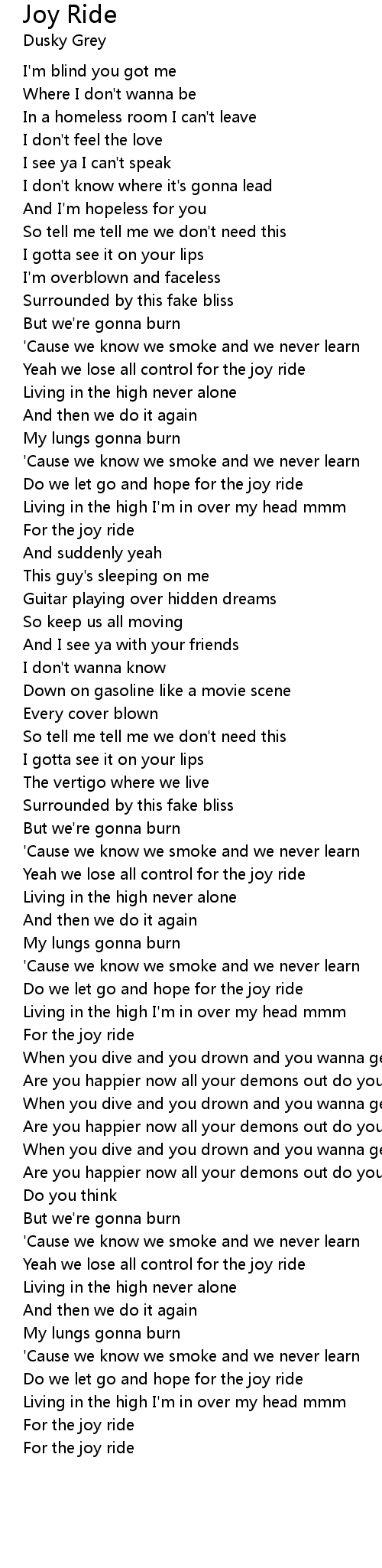 Yeah we lose all control for the joy ride |