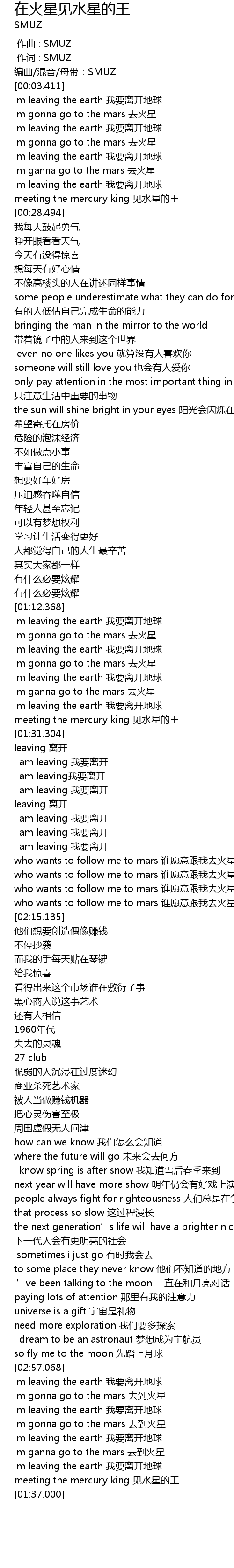 | [02:58.993] | im gonna go to the mars 去到火星 |