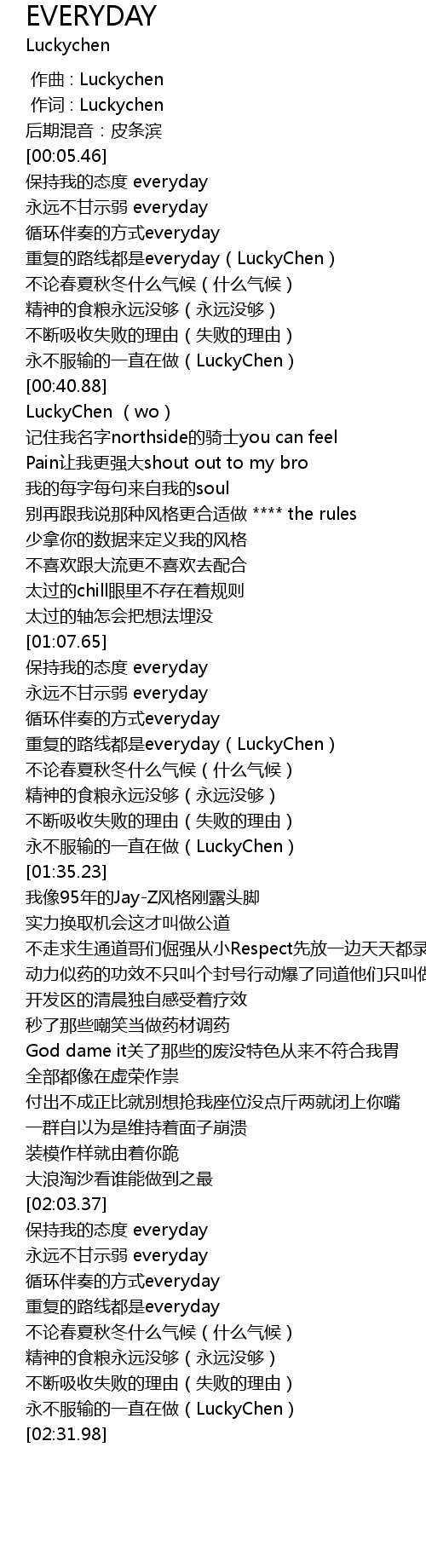 | [01:20.57] | chóng fù de lù xiàn dōu shì everyday LuckyChen |