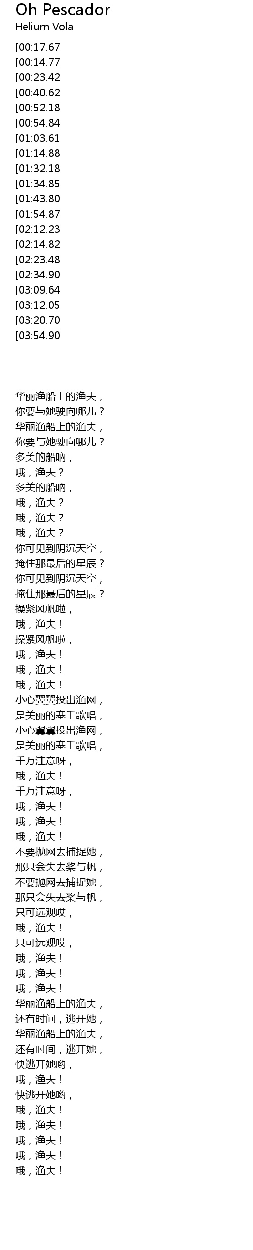 | [04:00.59][03:54.90][03:49.84][03:43.55][03:29.00][03:23.36] | Oh pescador! |