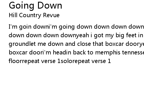 | I'm goin downi'm going down down down down downyeah i'm going downi'm going down down down down downyeah i got my big feet in the windowgot my head on the groundlet me down and close that boxcar dooryeah let me down and close that boxcar doori'm headin back to memphis tennessee and sweep young avenues floorrepeat verse 1solorepeat verse 1 |