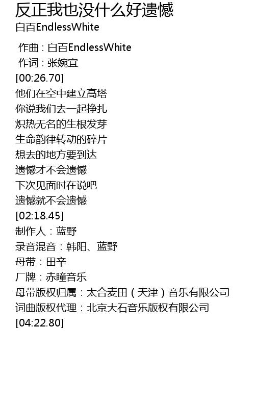 | [04:21.84] | 母带版权归属:太合麦田(天津)音乐有限公司 |
