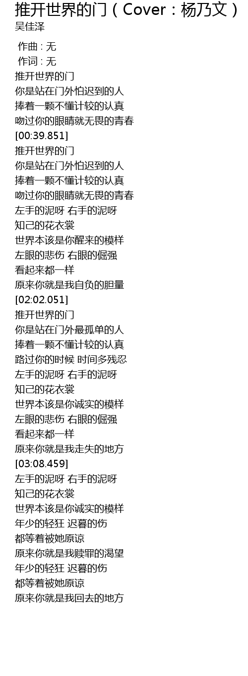 | [00:04.406] | tuī kāi shì jiè de mén |