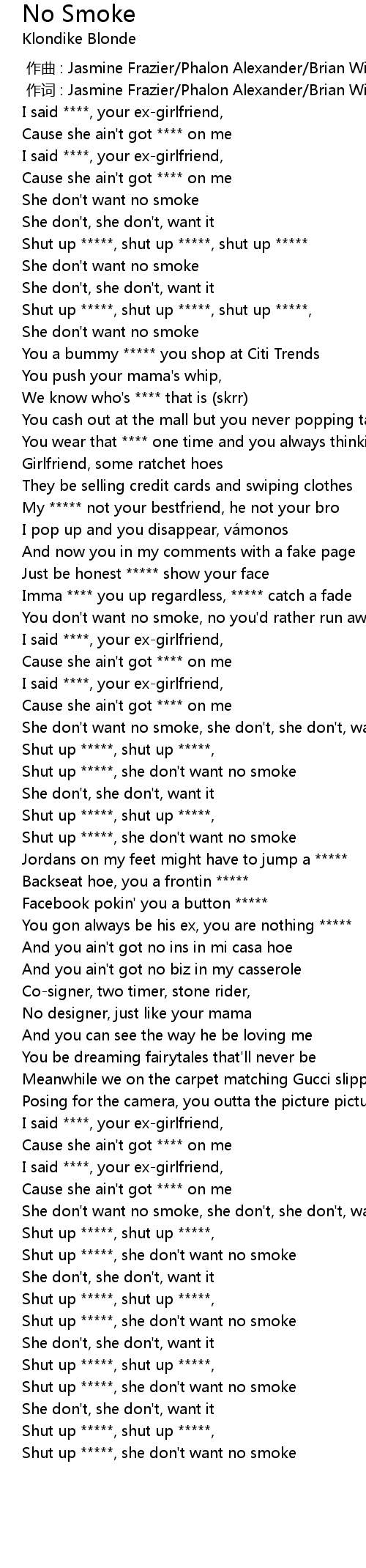 | [01:29.46] | Shut up *****, she don't want no smoke |