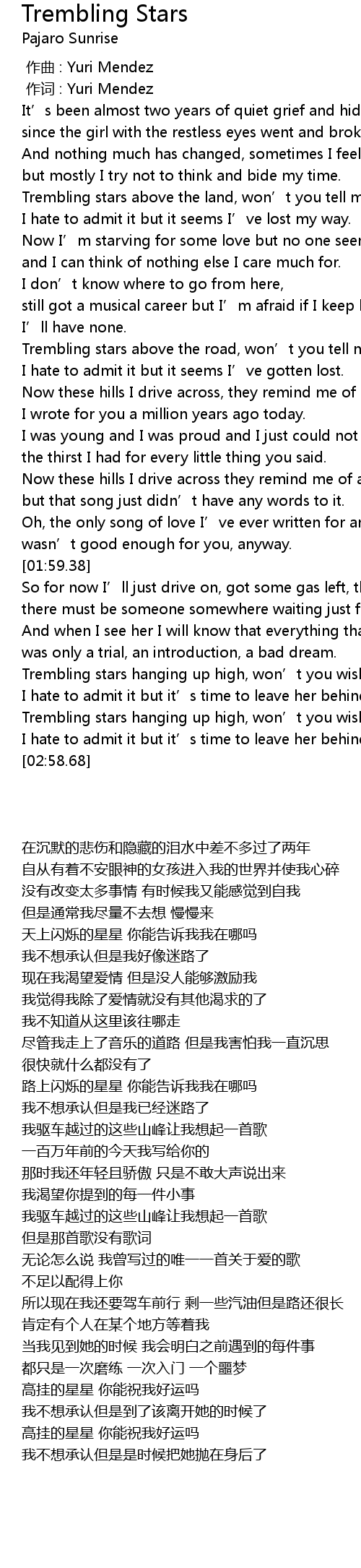 | [02:39.45] | Trembling stars hanging up high, won’t you wish me now good luck. |