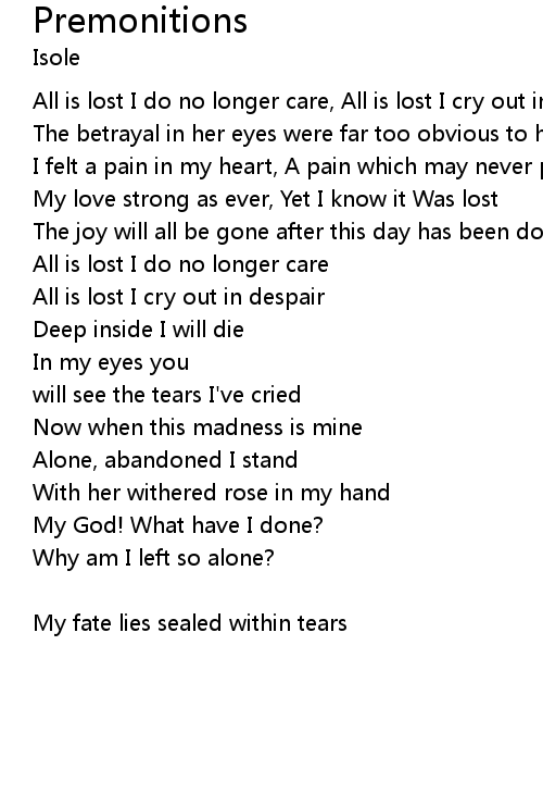 All is lost I do no longer care, All is lost I cry out in despair |