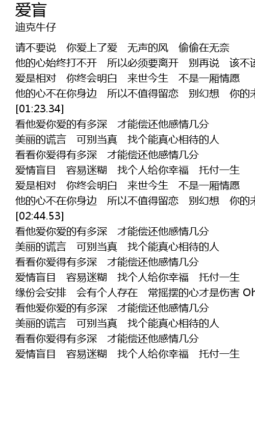 | [03:54.64] | 爱情盲目 容易迷糊 找个人给你幸福 托付一生 |