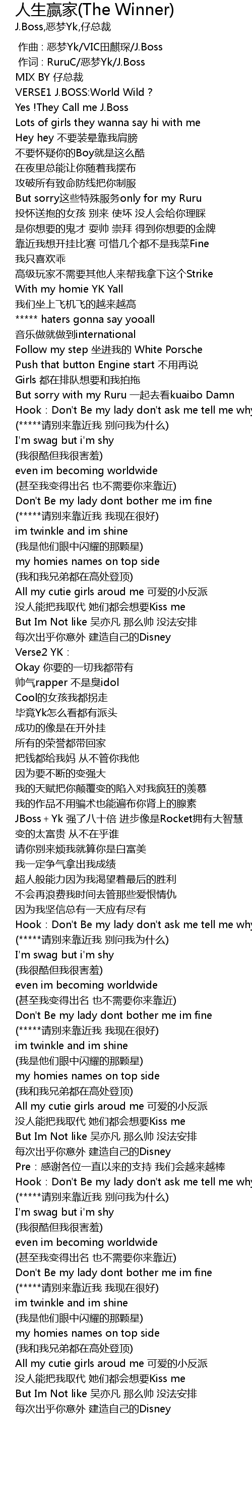 | [00:37.429] | kào jìn wǒ xiǎng kāi guà bǐ sài kě xī jǐ gè dōu bú shì wǒ cài Fine wǒ zhǐ xǐ huān guāi |