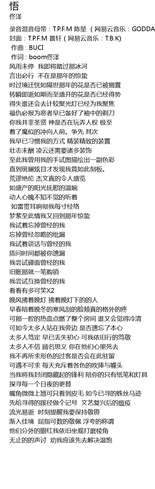 | 录音混音母带:T.P.F.M 陈堃 (网易云音乐:GODDAMNNNN) | |