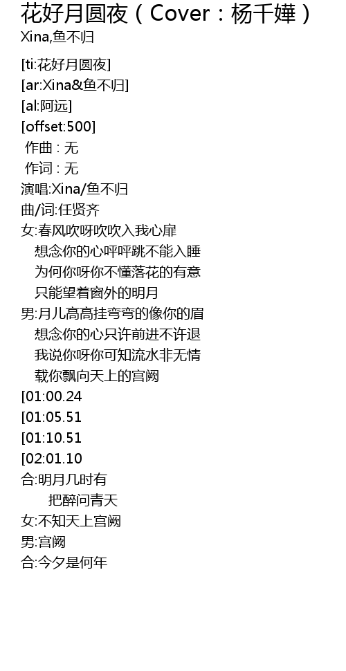 | [01:51.01][01:05.51] | zài zhè huā hǎo yuè yuán yè yǒu qíng rén ér chéng shuāng duì |