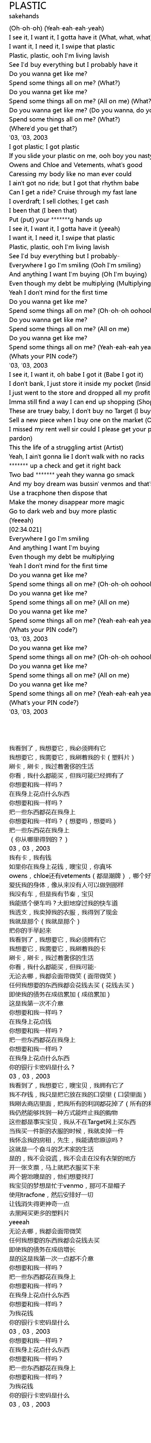 | [00:20.652] | Plastic, plastic, ooh I'm living lavish |