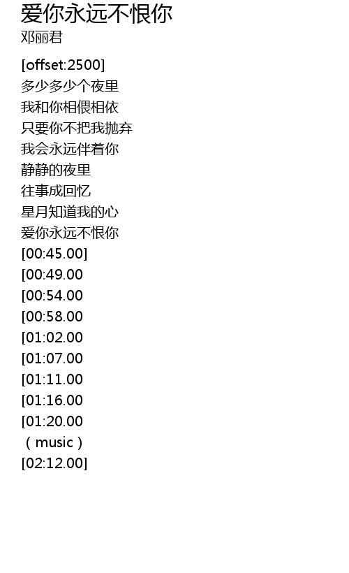 | [02:04.00][01:20.00] | ài nǐ yǒng yuǎn bù hèn nǐ |