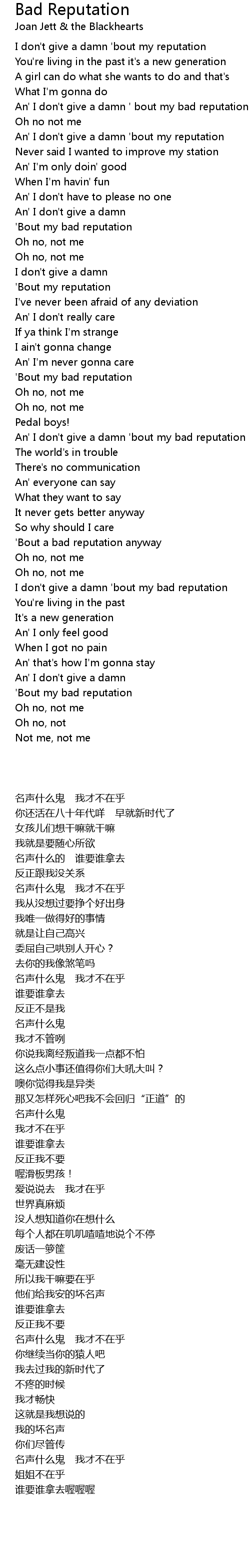 An' I don't give a damn ' bout my bad reputation |