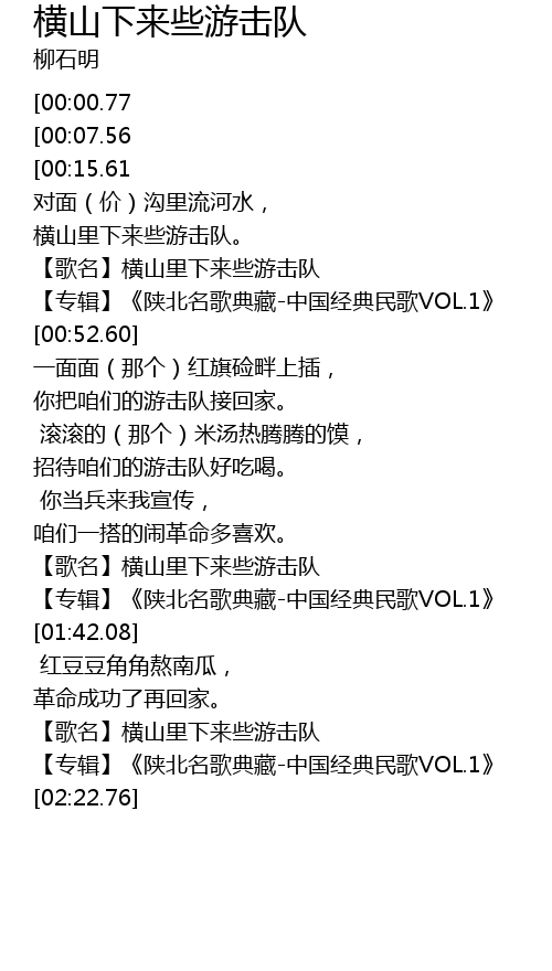 | [00:21.15][00:00.77] | 【歌名】横山里下来些游击队 |