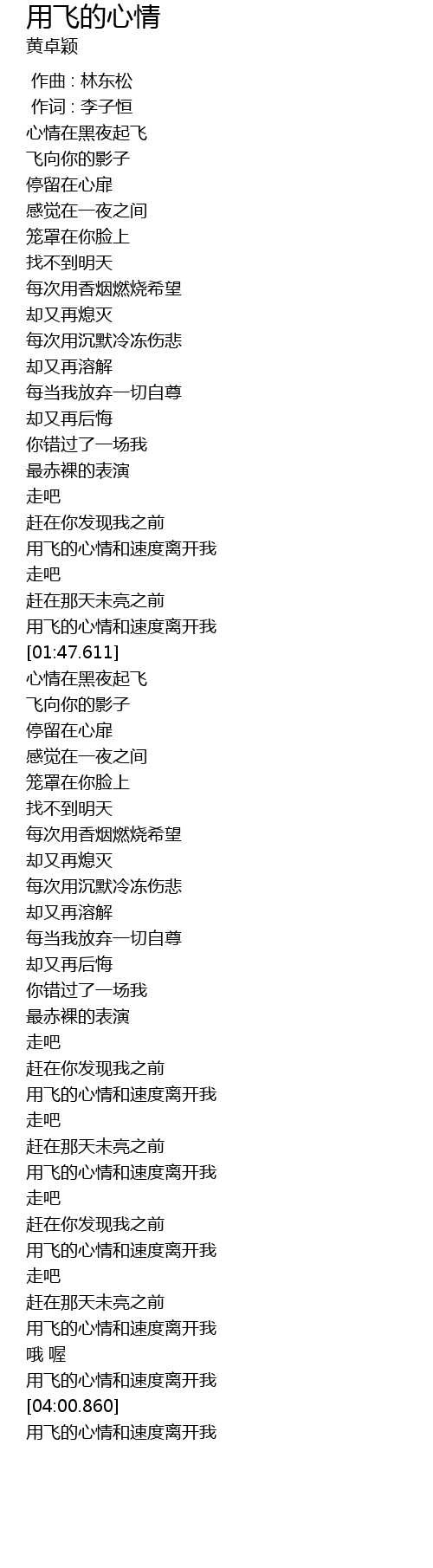 | [01:34.569] | 用飞的心情和速度离开我 |