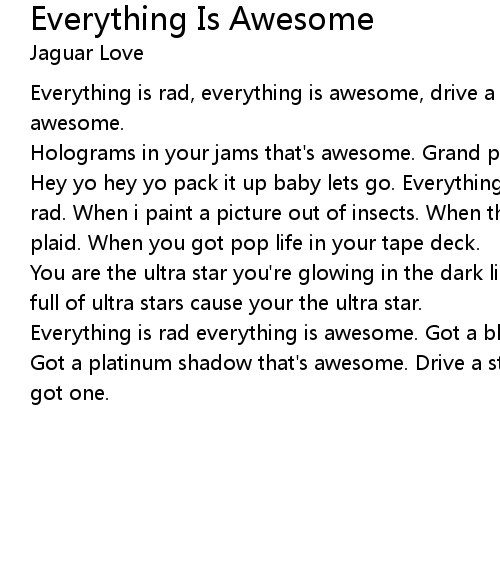 Hey yo hey yo pack it up baby lets go. Everything is awesome everything is so rad. When i paint a picture out of insects. When the midnight sky turns so plaid. When you got pop life in your tape deck. |