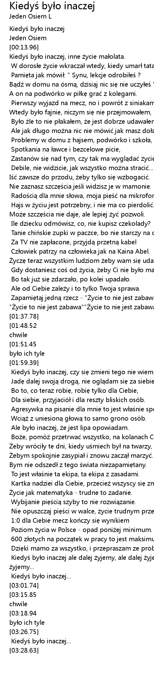 | [03:21.41][03:15.85][03:10.51][03:05.18] | Kiedyś było inaczej zapamiętaj dobre chwile |