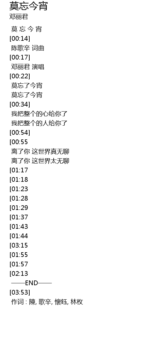 | [00:00.00] | 作词 : 陳, 歌辛, 懷鈺, 林枚 |