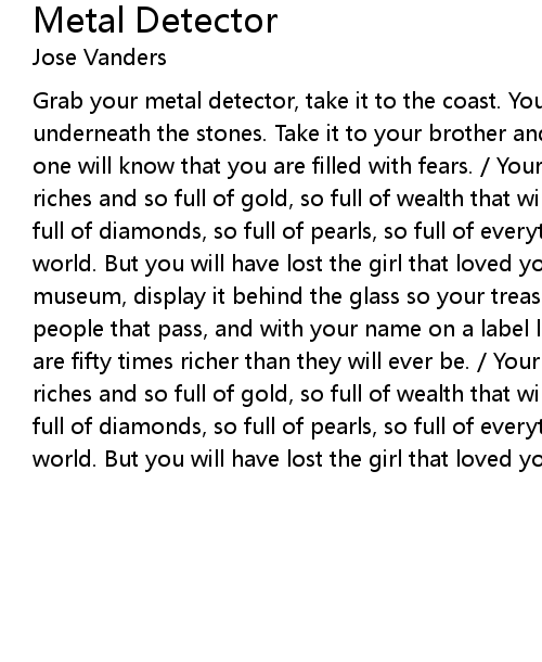 | Grab your metal detector, take it to the coast. You will find some treasure underneath the stones. Take it to your brother and wipe away your tears, so no one will know that you are filled with fears. / Your life will be so full of riches and so full of gold, so full of wealth that will never get old and so full of diamonds, so full of pearls, so full of everything that’s good in this world. But you will have lost the girl that loved you most. / Take it to a museum, display it behind the glass so your treasure will be seen by all the people that pass, and with your name on a label letting everyone see that you are fifty times richer than they will ever be. / Your life will be so full of riches and so full of gold, so full of wealth that will never get old and so full of diamonds, so full of pearls, so full of everything that’s good in this world. But you will have lost the girl that loved you most. |