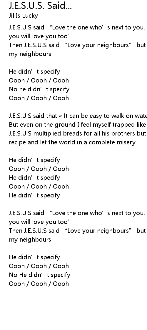 | Then J. E. S. U. S said " Love your neighbours" but he didn' t know who' d be my neighbours | |