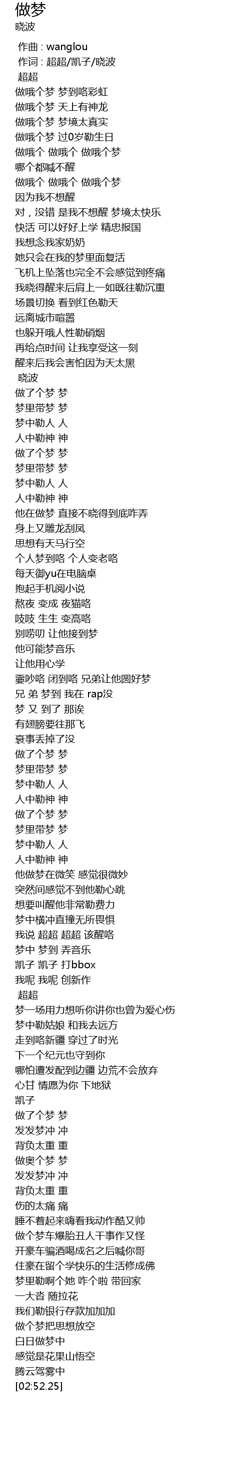 | [01:20.36] | 嫑吵咯 闭到咯 兄弟让他圆好梦 |