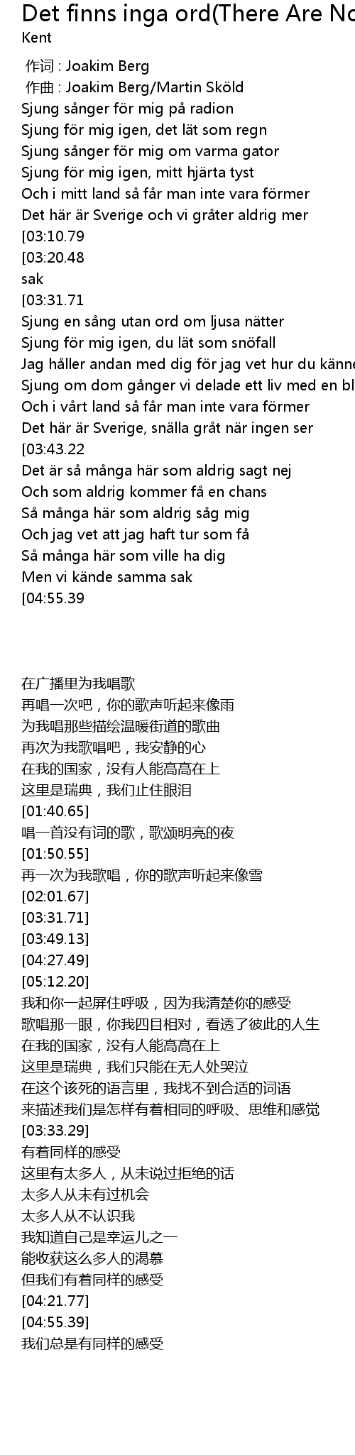 | [01:40.65][03:10.79] | Det finns inga ord f r det p det h r j vla spr ket |