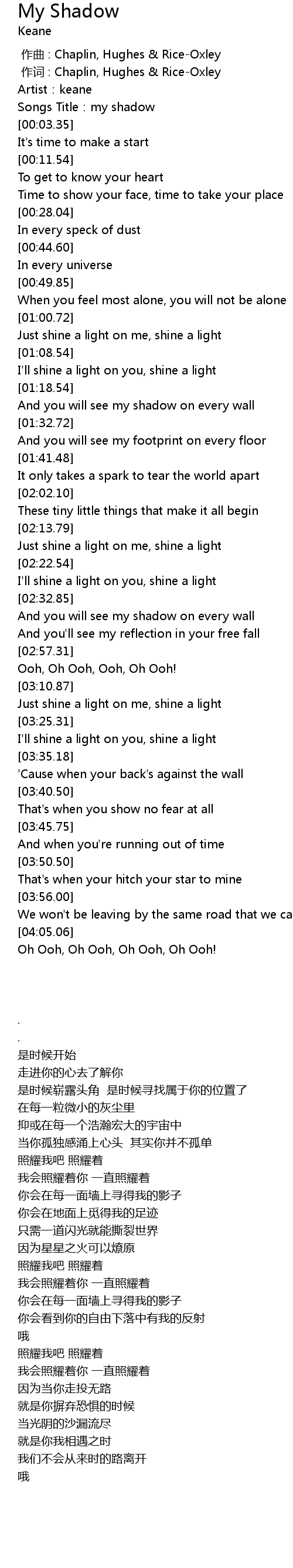 | [00:00.00] | 作曲 : Chaplin, Hughes & Rice-Oxley |