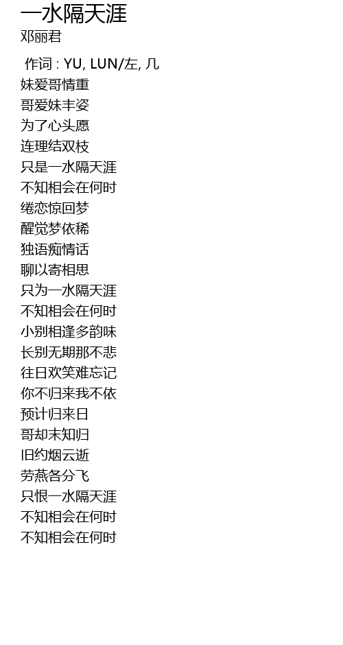 | [00:36.410] | 只是一水隔天涯 |
