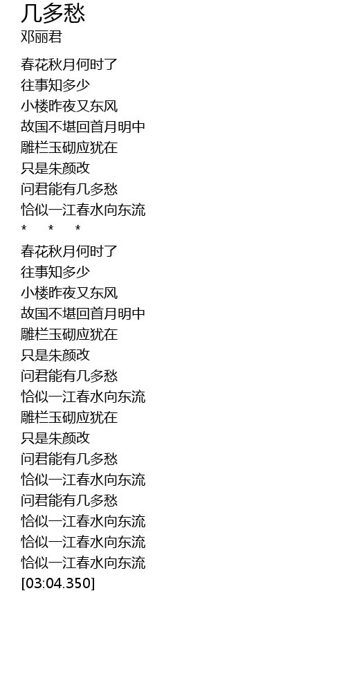 | [02:21.250] | wèn jūn néng yǒu jǐ duō chóu |