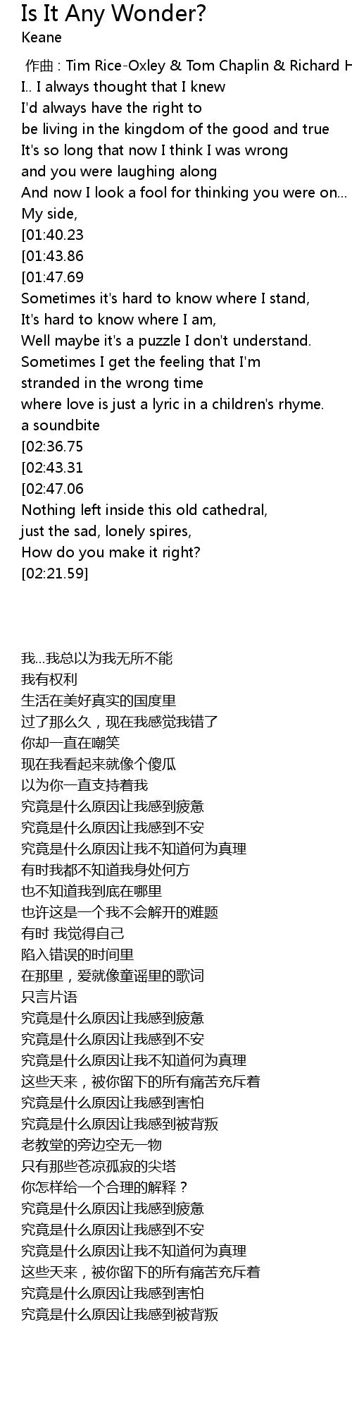 | [01:03.21][01:47.69][02:32.27] | Is it any wonder I don' t know what' s right? |