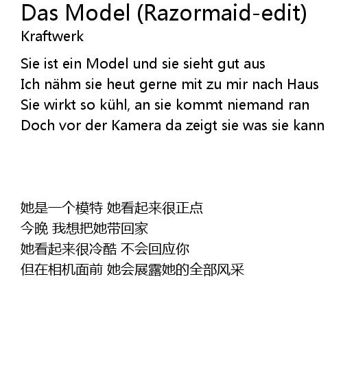 | [01:04.65] | Sie ist ein Model und sie sieht gut aus |