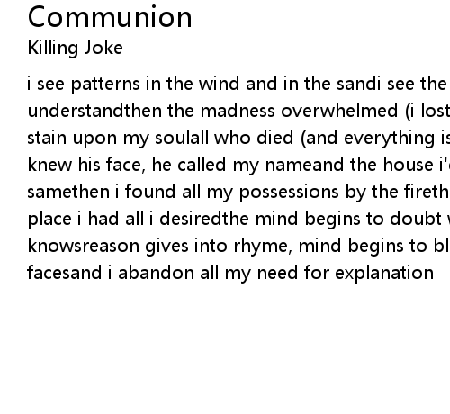 i see patterns in the wind and in the sandi see the stars, i read the clouds, i understandthen the madness overwhelmed (i lost control)it was cut out for each stain upon my soulall who died (and everything is alive)communioni saw a man, i knew his face, he called my nameand the house i'd never seen still looked the samethen i found all my possessions by the firethe physical world fell into place i had all i desiredthe mind begins to doubt what the heart already knowsreason gives into rhyme, mind begins to blowreoccurring people numbers facesand i abandon all my need for explanation |