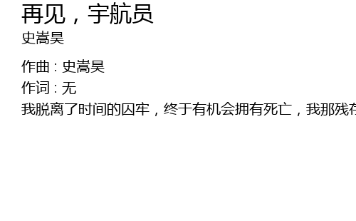 | wǒ tuō lí le shí jiān de qiú láo, zhōng yú yǒu jī huì yōng yǒu sǐ wáng, wǒ nà cán cún de jì yì zhōng yú kě yǐ huà wéi yǒng héng, wǒ níng shì zhe shì jiān de yī qiè, yī qiè de yī qiè dōu shì nà me měi hǎo, ér wǒ què cháng jǐn le yǒng yuǎn de gū jì, wǒ kàn dào le dì bā zhǒng yán sè, dì jiǔ zhǒng yán sè, dì shí zhǒng yán sè, wǒ tīng dào le yǔ zhòu de hū huàn, nà yī zhǒng yǒng héng de shēng mìng, shuí yě kàn bú jiàn tīng bu jiàn, wǒ kě yǐ zhēn zhèng yōng bào yǔ zhòu, wǒ zhōng yú zǒu xiàng le zuì hòu de shí jiān, yǒng yuǎn shǔ yú wǒ de yǔ zhòu |