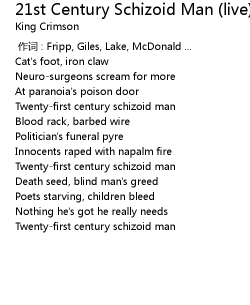 | [00:33.67] | Twentyfirst century schizoid man |