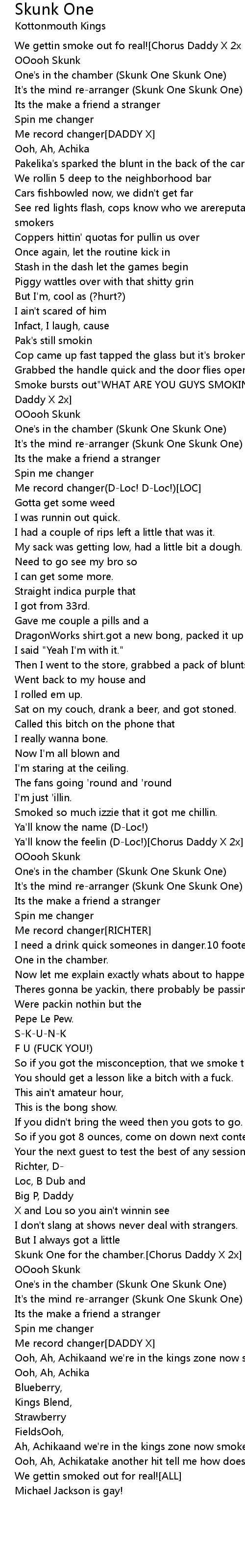 Smoke bursts out"WHAT ARE YOU GUYS SMOKING?""Skunk One is what we tokin!"[Chorus Daddy X 2x] |