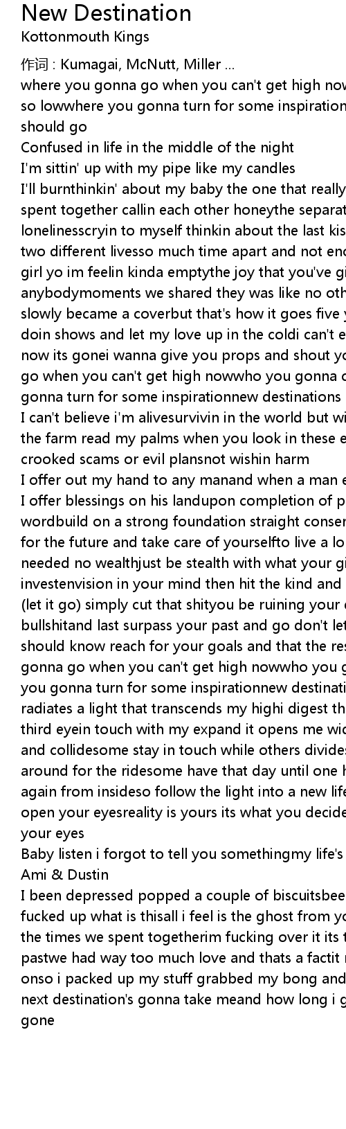 | I offer blessings on his landupon completion of passage earning respect for your wordbuild on a strong foundation straight conserve barely splurgeya gotta plan for the future and take care of yourselfto live a long happy life you never needed no wealthjust be stealth with what your givin make decisions to investenvision in your mind then hit the kind and be blessederase the stress let it go simply cut that shityou be ruining your day over the same bullshitand last surpass your past and go don' t let your fate be controlledyou should know reach for your goals and that the rest will be gold so? where you gonna go when you can' t get high nowwho you gonna call when you feel so lowwhere you gonna turn for some inspirationnew destinations is where we should gomy soul radiates a light that transcends my highi digest the universe right though my third eyein touch with my expand it opens me widethese spirits connect transform and collidesome stay in touch while others dividesome flow and dive and hang around for the ridesome have that day until one has diedshedding your skin born again from insideso follow the light into a new lifetake a deep breath relax and open your eyesreality is yours its what you decidetake a deep breath and open your eyes | |