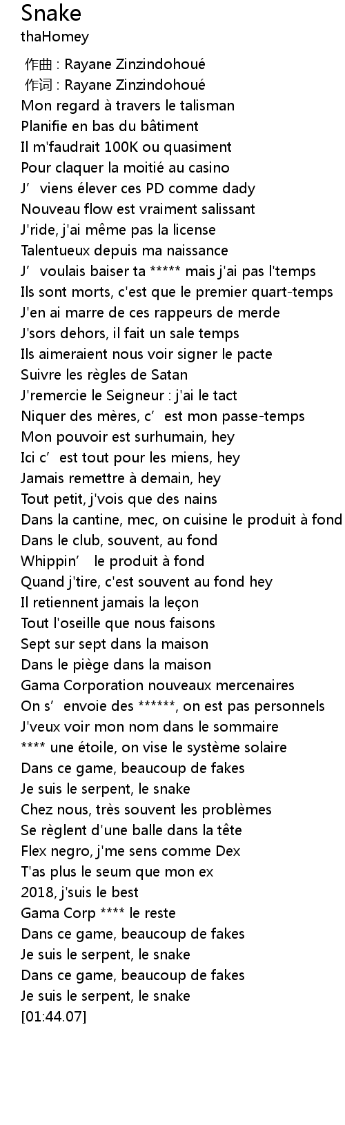 | [01:33.00] | Je suis le serpent, le snake |